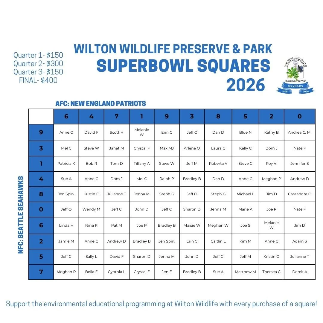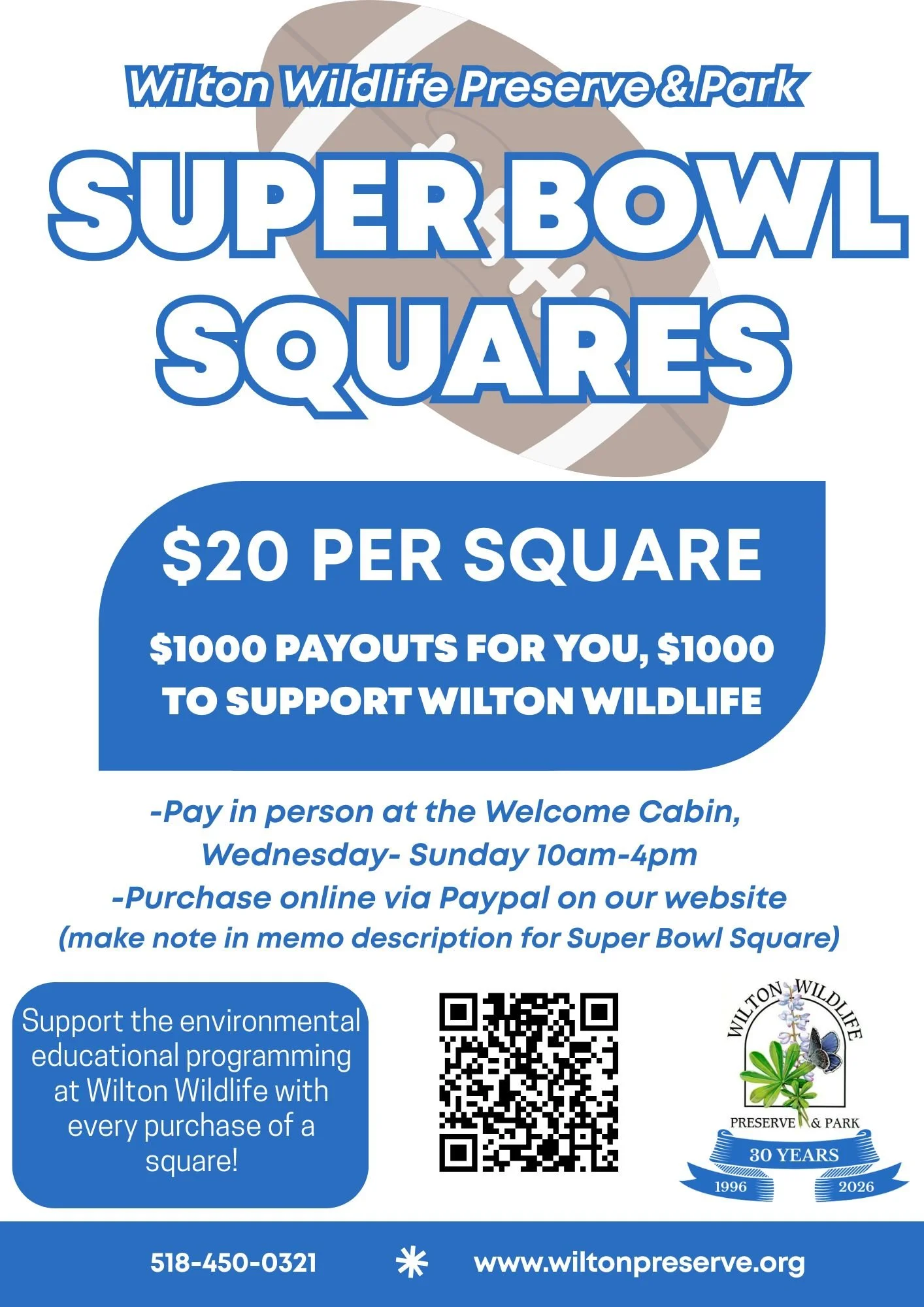 Join in on the Super Bowl fun with the purchase of a square for $20! Have fun watching the game while also supporting the environmental educational programming done at Wilton Wildlife! More information below!