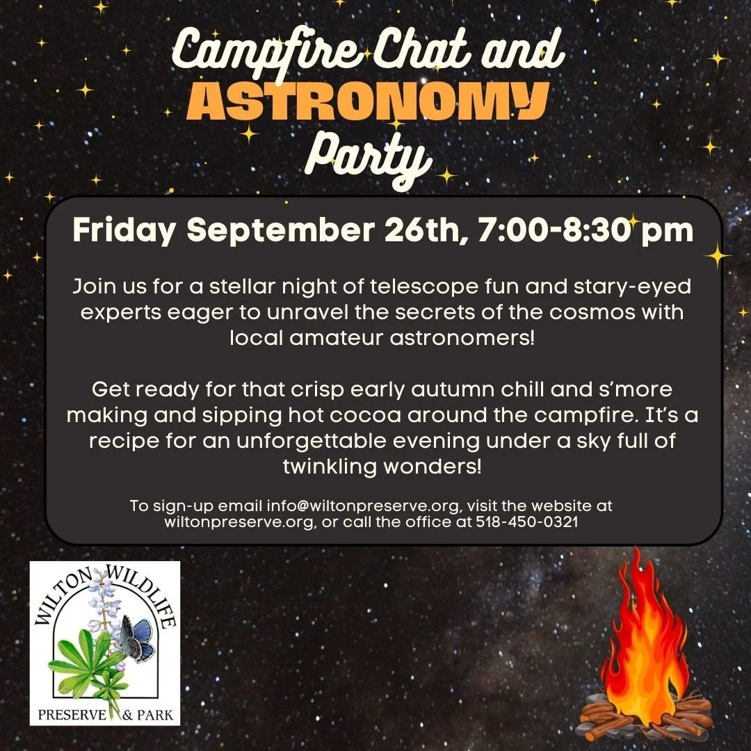 Have fun around the campfire while learning about the fall night sky. Local amateur astronomers will have telescopes for viewing the stars. S’mores and hot cocoa provided!
