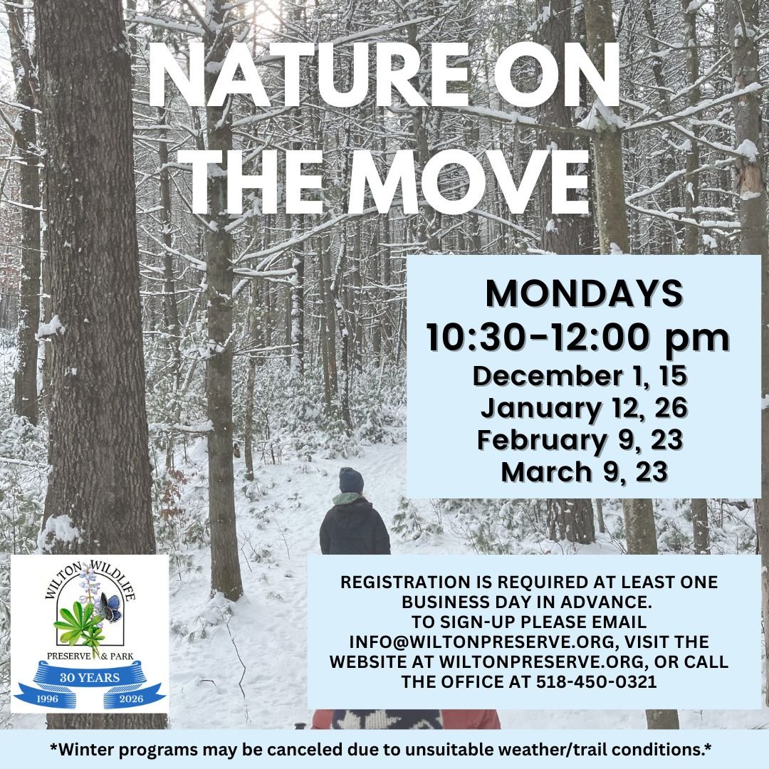 Nature on the Move Monday, January 12, 2026 10:30 AM 12:00 PM Wilton Wildlife Preserve & Park 90 Scout Rd Gansevoort, NY, 12831 United States (map) Google Calendar ICS Come enjoy nature with others looking to get outside. This walk is geared towards gentle exercise and those with basic fitness levels. This program is suitable for ages 16 and up.To register for this program, click here.