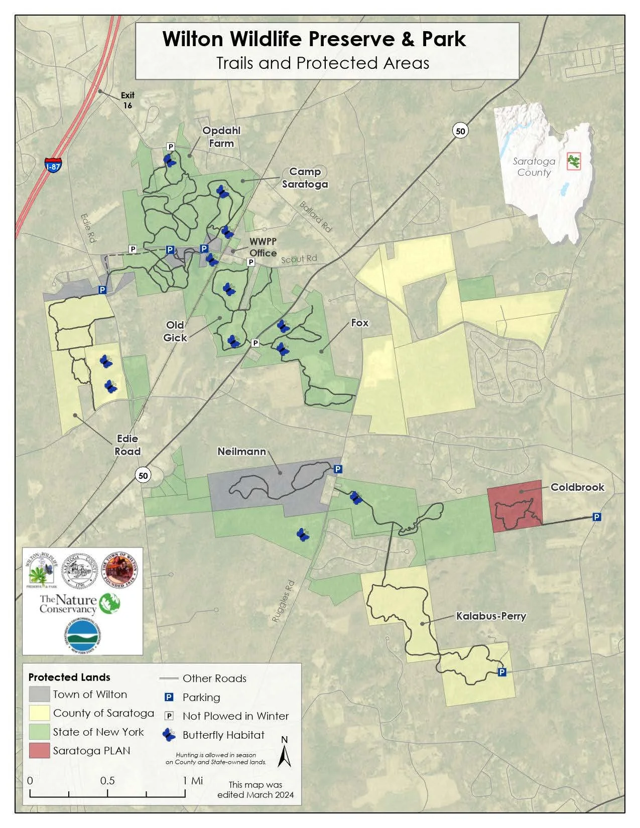 There are over 2,400 acres of protected lands that make up the Wilton Wildlife Preserve & Park. The map color codes the protected lands to identify each parcel’s owner. Wilton Wildlife Preserve & Park partners with the Town of Wilton, New York State Department of Environmental Conservation, Saratoga County, and The Nature Conservancy who all own the protected lands of the Preserve & Park.
